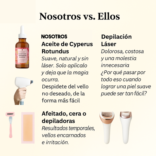Descubre una solución efectiva para eliminar el vello sin dolor. Nuestro aceite reduce el crecimiento del vello, dejando la piel suave y sedosa. Ideal para quienes buscan una alternativa natural a las cremas depilatorias convencionales.